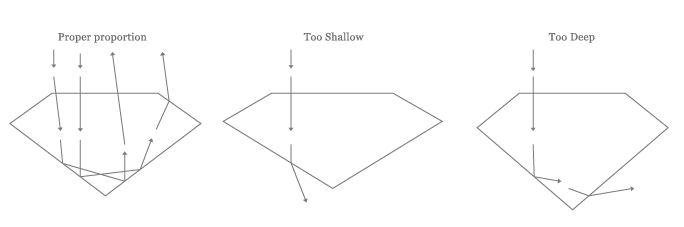 The proportions of a diamond refer to the relationships between the table size, crown angle and pavilion depth. Based on these proportions and relationships, a diamond’s cut grade will fall within one of these categories: